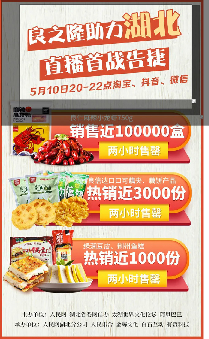 良之隆助力湖北重振,首戰(zhàn)取得開(kāi)門(mén)紅!來(lái)自武漢良之隆食材股份有限公司的良仁麻辣小龍蝦銷(xiāo)售近100000盒;良信達(dá)口口可藕夾、藕餅產(chǎn)品熱銷(xiāo)近3000份;綠潤(rùn)豆皮、荊州魚(yú)糕熱銷(xiāo)近1000份