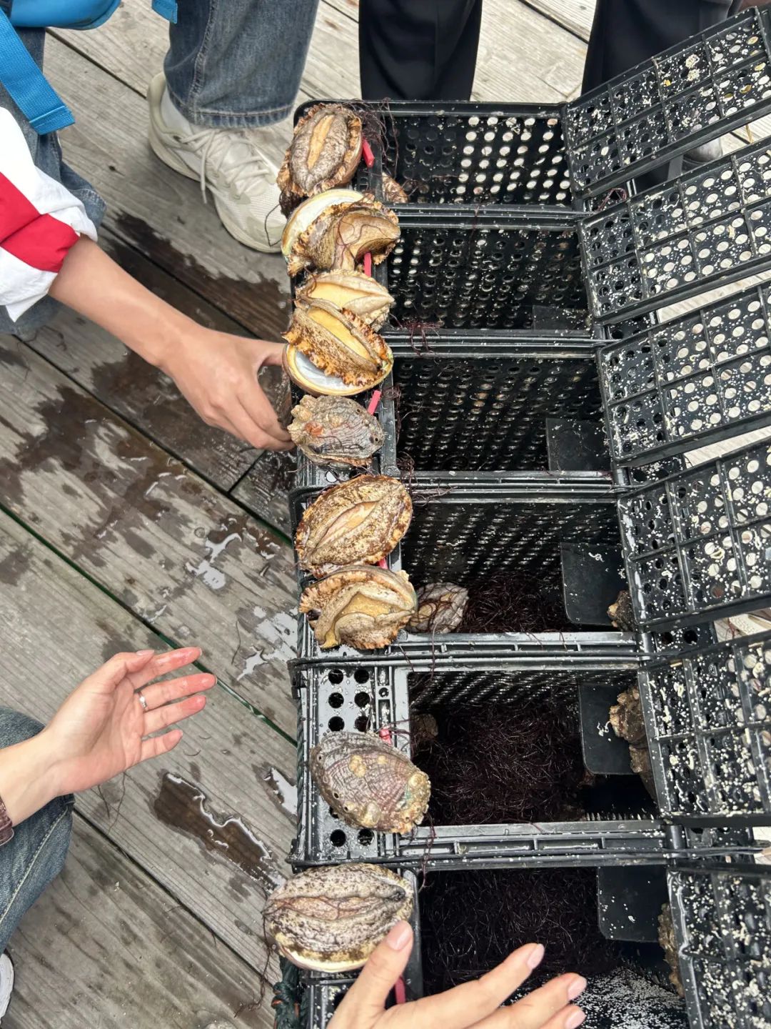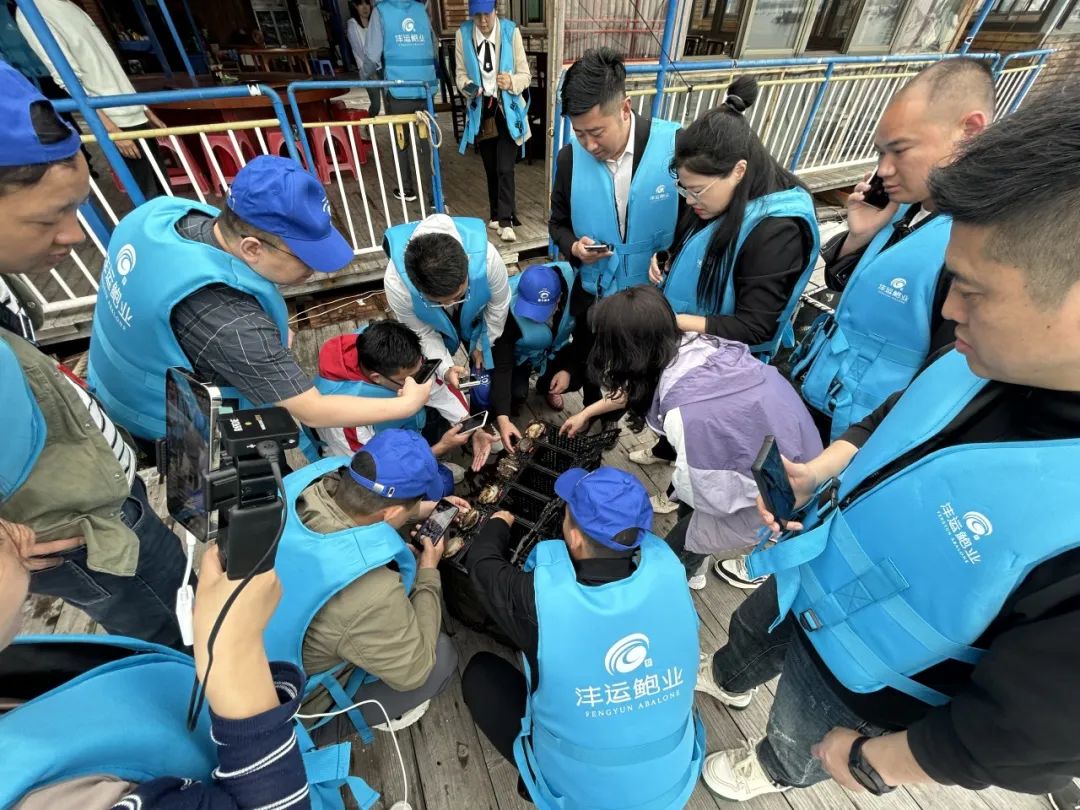 放眼望去,海洋牧場(chǎng)無(wú)邊無(wú)際,工人們正在嫻熟地往籠子里投喂鮮嫩的龍須菜和海帶。在灃運(yùn)鮑業(yè)活鮑負(fù)責(zé)人黃總細(xì)致的講解及帶領(lǐng)下,考察團(tuán)成員們親身來(lái)到了鮑魚(yú)的海上養(yǎng)殖平臺(tái),目睹了鮑魚(yú)寶寶的生長(zhǎng)環(huán)境;學(xué)習(xí)了如何分辨鮑魚(yú)公母、身體結(jié)構(gòu)、養(yǎng)殖等小知識(shí),并現(xiàn)場(chǎng)感受到了鮑魚(yú)滿滿的活力。
