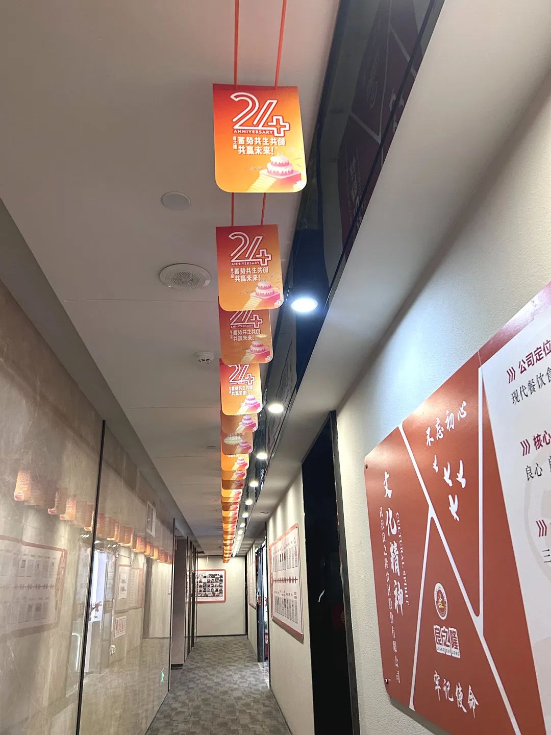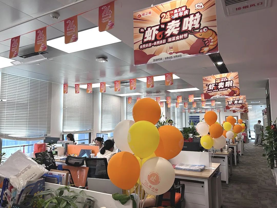 公司總部及全國各門店在公共區(qū)域、辦公場(chǎng)所精心布置,通過在門頭、前臺(tái)、中庭、辦公區(qū)域張貼24周年活動(dòng)標(biāo)識(shí)、宣傳標(biāo)語、吊旗等方式,全面營造隆重?zé)崃?、喜慶活潑的慶祝氣氛。